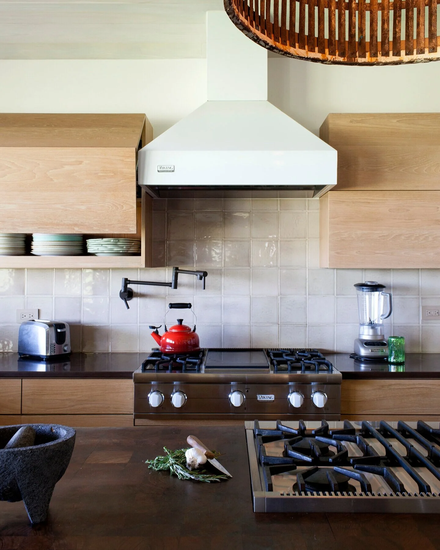It was decided to let the ocean and sky rein blue and create the home with warm sand and earth tones. To achieve this Jamie used terrazzo floors, ocean style glass and gold tiles from island stone and locally made wood counters, topped off with a two story fishnet chandelier made by a local artisan. Ohia wood uprights from the big island anchor and the huge ceiling with a teak truss. Furnishings were purchased from Pacific Home to bring it all together.